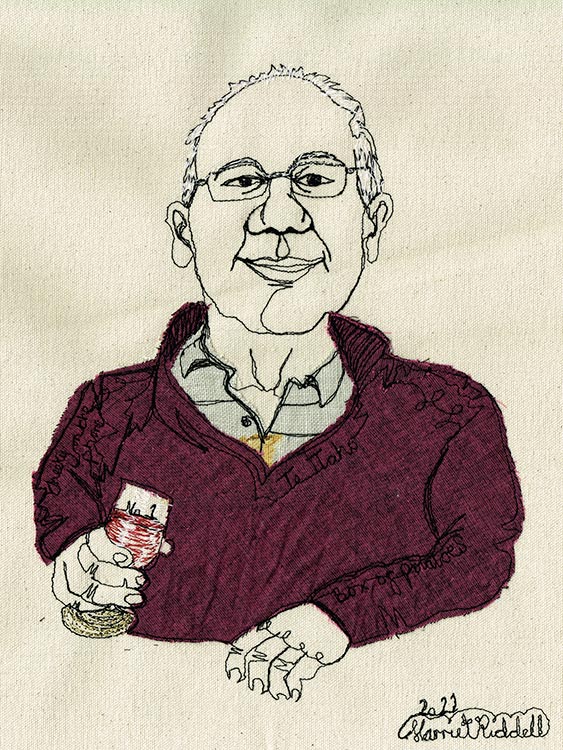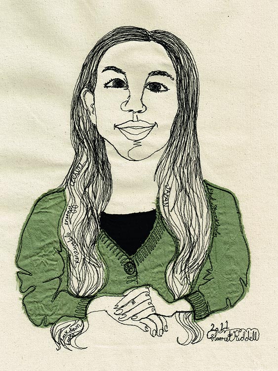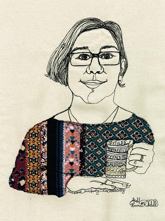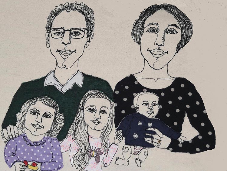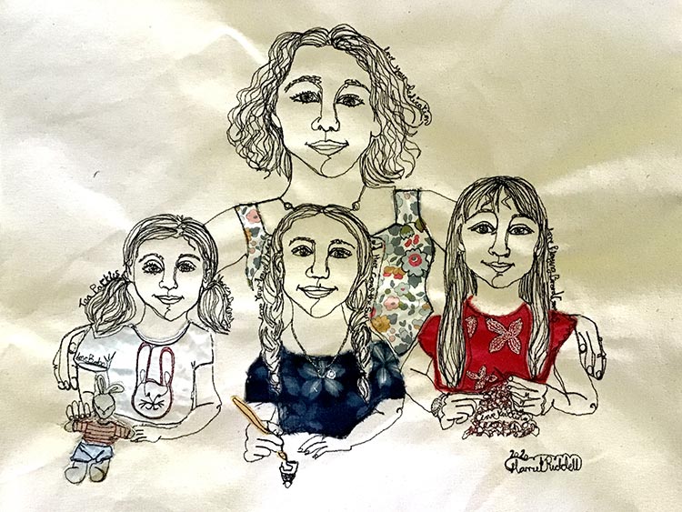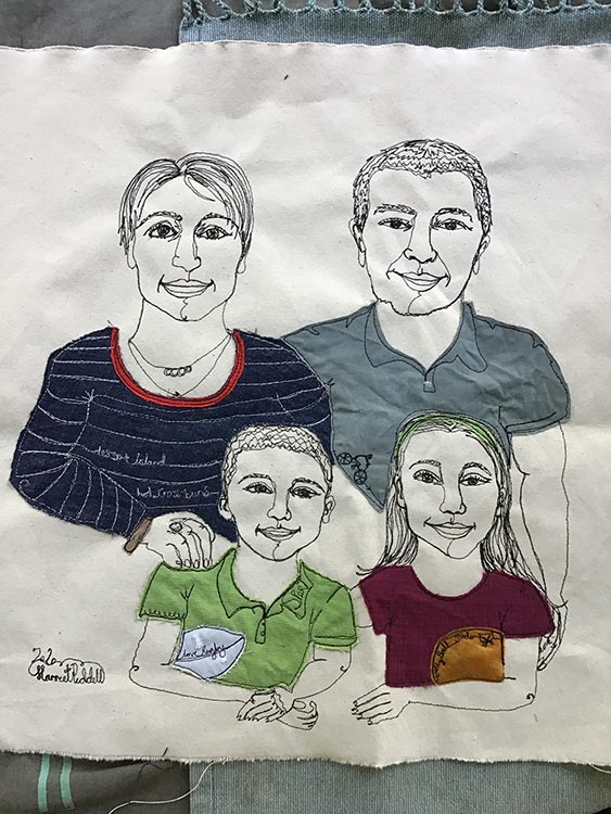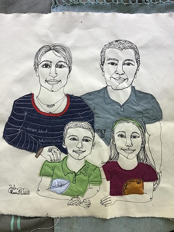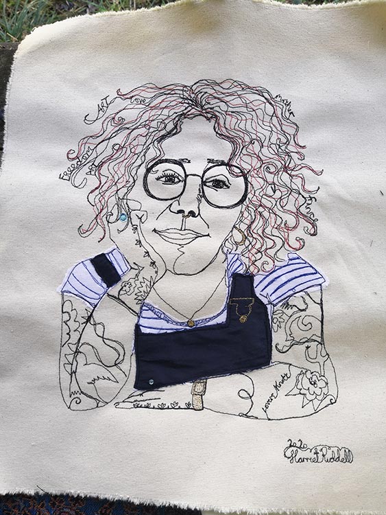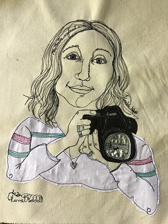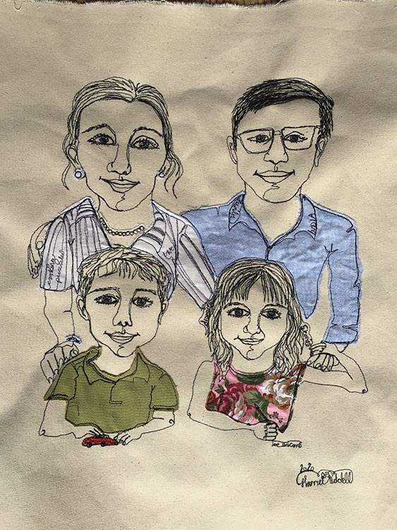 Watch as I capture your likeness with my sewing machine as I speak to you about your life. Scraps of material are appliqued onto the art work to match what you are wearing, fabric is used to capture jewellery and words are selected from your story and are hidden within the piece.