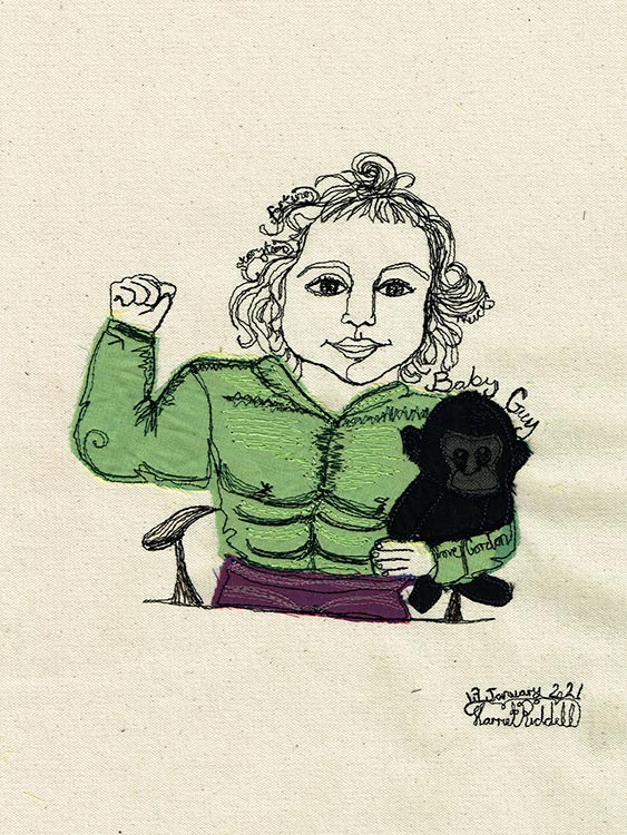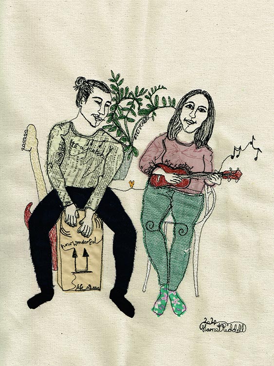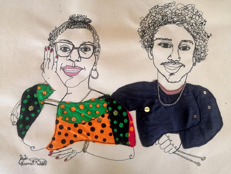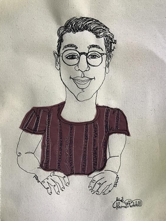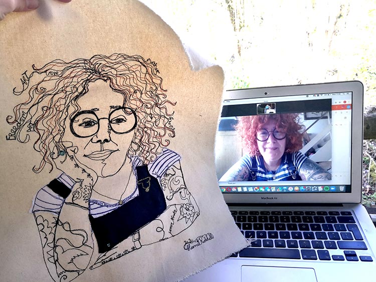I love stitching portraits and before the pandemic I always chose to work from life. As a lot of these opportunities have been taken away, I began stitching portraits via Zoom. It has been brilliant! I get to meet interesting people from around the world and they get to watch me work as I react to them and our conversation.